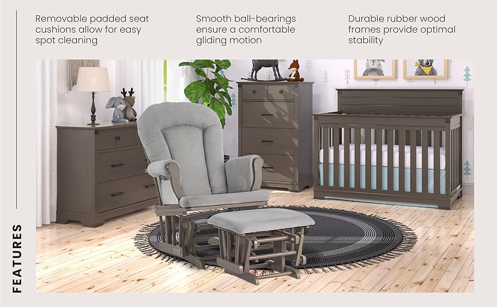 Amazon Com Child Craft Cozy Glider Rocker And Ottoman Set Padded Cushion With Convenient Storage Pockets Solid Wood Base Frame Dapper Gray With Light Gray Cushion Baby